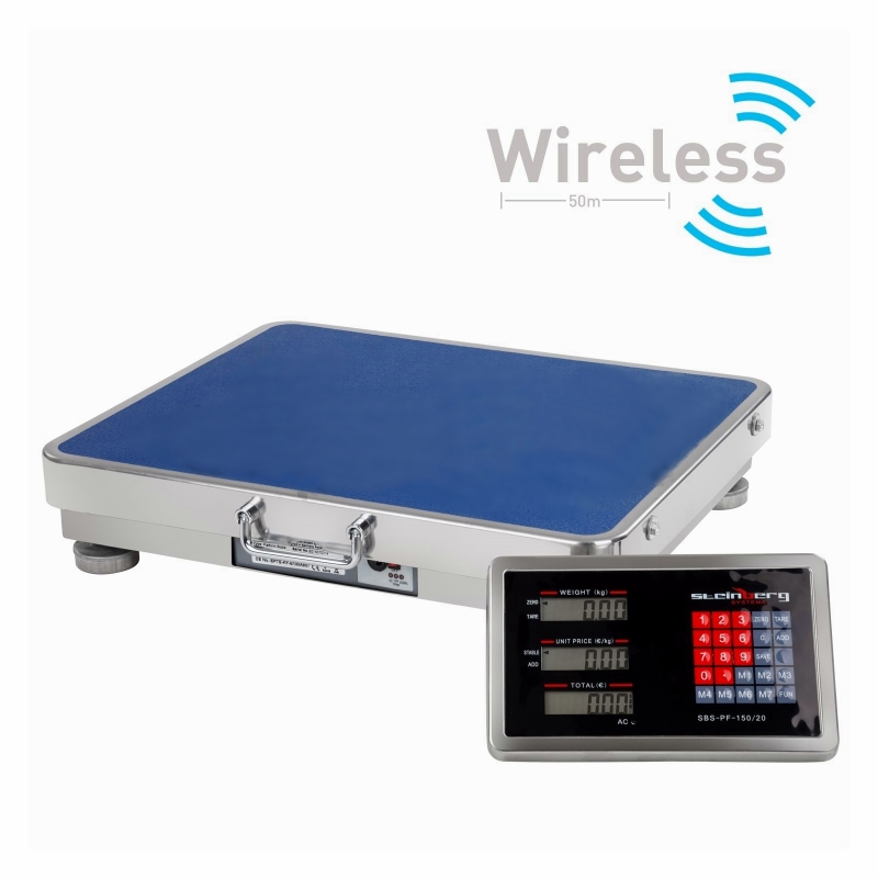 Digitalna tehtnica z ločenim - brezžičnim displayem. Obremenitev tehtnice je do 150kg z delitvijo 20g. Izredno natančna tehtnica za uporabo v živilski industriji, kmetijstvu, skladiščih ipd. Tehtalna površina je nerjaveča (INOX), dimenzij 52 x 42cm. Integrirana osvetlitev ozadja, omogoča enostavno odčitavanje izmerjenih vrednosti, tudi v temnejših delovnih pogojih. Brezžičen doseg 50m.