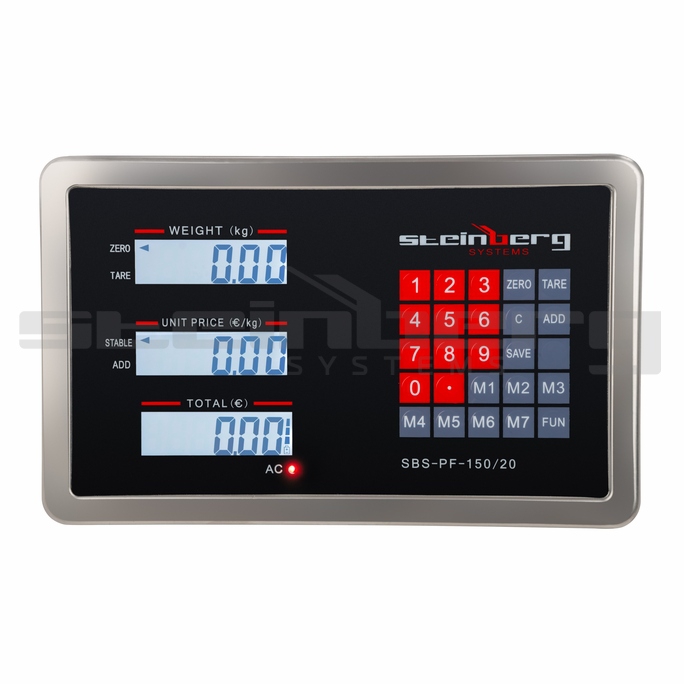 Digitalna tehtnica z ločenim - brezžičnim displayem. Obremenitev tehtnice je do 150kg z delitvijo 20g. Izredno natančna tehtnica za uporabo v živilski industriji, kmetijstvu, skladiščih ipd. Tehtalna površina je nerjaveča (INOX), dimenzij 52 x 42cm. Integrirana osvetlitev ozadja, omogoča enostavno odčitavanje izmerjenih vrednosti, tudi v temnejših delovnih pogojih. Brezžičen doseg 50m.